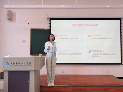 宋倩老师聚焦电子商务“技术赋能+实践驱动”的核心特色,梳理了多层次培养体系。她介绍,电子商务基础,管理学基础,电子商务法律法规等课程筑牢专业根基,商务数据分析,视觉营销设计,跨境电商实务等专业核心课程强化提升专业技能,实践教学环节锻炼学生电商职业素养,全面培养学生综合能力。通过对陕西当地电商行业发展现状分分析以及就业岗位介绍,宋老师鼓励大家认真学习,积极参加各类比赛,在校期间不断打磨历练,争取在毕业后做一名合格的电商人。